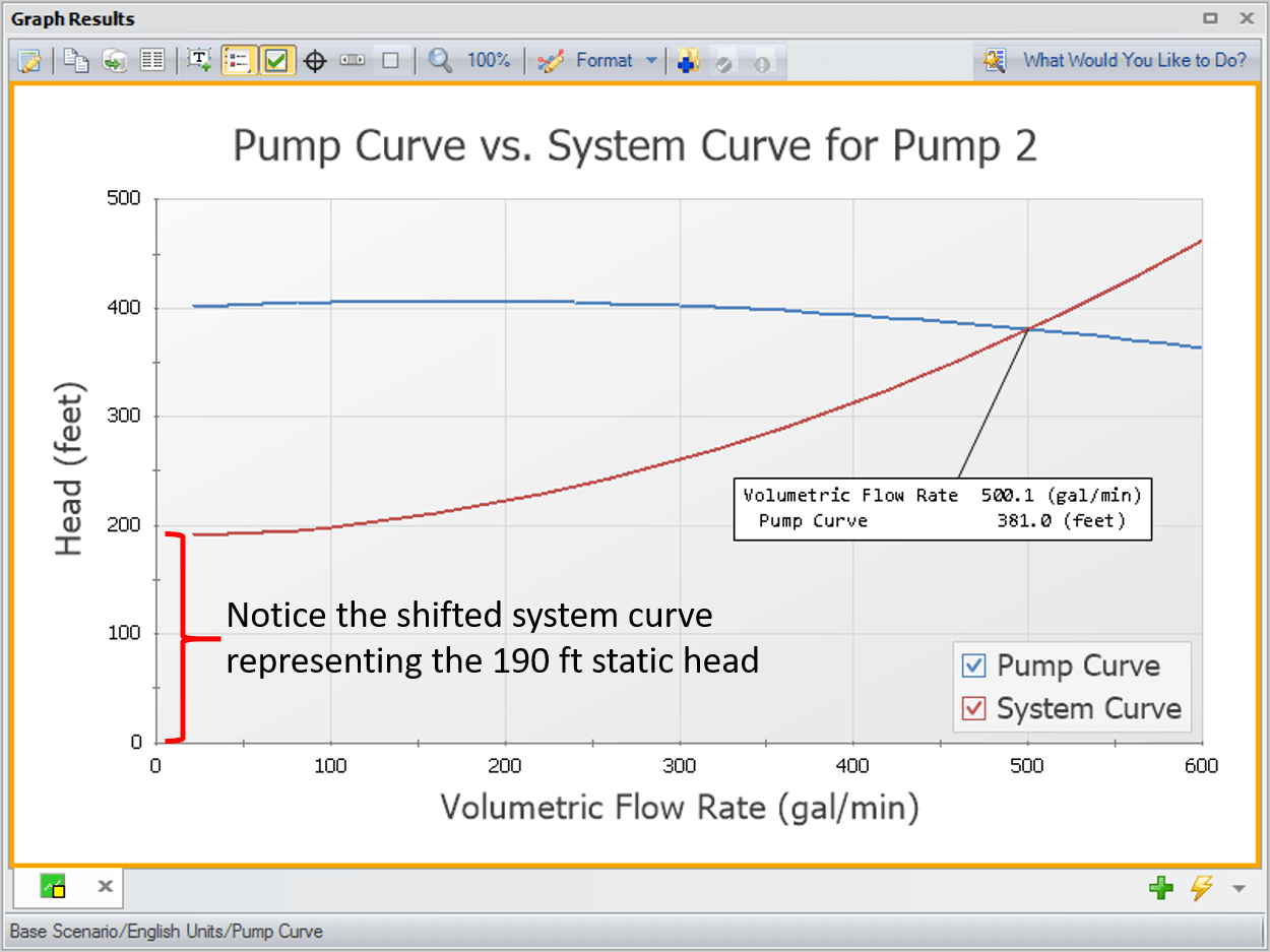 Figure 3 is an AFT Fathom model of the simple system shown in Figure 1 where water is pumped up a 200 ft (61 m) elevation over about 1000 ft (305 m) of pipe (10 ft suction + 990 ft discharge) (3 m suction + 302 m) and a pump curve has been entered for the pump. Upon review of the results in Figure 4, the total piping head loss due to friction is about 191 ft (58.2 m) (1.291 ft + 189.677 ft) (0.393 m + 57.8 m) and the static head is equal to 190 ft (58 m) (200 ft discharge reservoir liquid surface elevation - 10 ft supply reservoir liquid surface elevation) (61 m discharge reservoir liquid surface elevation - 3 m supply reservoir liquid surface elevation). Therefore, the total pump head that is required in order to overcome the 191 ft (58.2 m) of frictional resistance and 190 ft (58 m) static head is about 381 ft (116 m), which is exactly what the results are showing for the Pump Summary. In the pump vs. system curve for this model in Figure 5, you can easily see that the pump and system curves intersect at the operating point of 500 gpm (113.6 m^3/hr) and 381 ft (116 m).