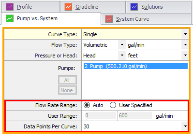The way that AFT Fathom generates the system curve is that it will take the model into the background as it generates the system curve and it modifies the pump to a pseudo-fixed flow pump. Then the model is run over a range of flow rates. At each flow rate, the pump head that is required to overcome the system resistance and elevation change at that flow rate is calculated. After the model is run several times over a range of flow rates, it is the resulting pump head requirements at each given flow rate that will be plotted in order to generate the system curve. Figure 6 shows you exactly what range of flow rates the pump is run at to generate the system curve. The "Flow Rate Range" can either be automatically generated by AFT Fathom, or directly specified by the user. Then based upon the number of "Data Points Per Curve" (which is 30 by default), the user can determine exactly what flow rate values are used for the system curve generation process. The pump curve that is plotted is simply the user-defined pump curve.
