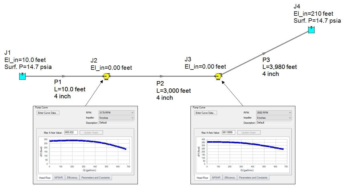 Let's start the discussion with multiple pumps in series configuration. In Figure 1 below, there are two pumps in series, separated by 3,000 feet of piping with an overall system elevation change of 200 feet. As you can see, the pumps are different with different pump curves. Both have 9-inch impellers, but one operates at 3,179 rpm while the other operates at 3,550 rpm.