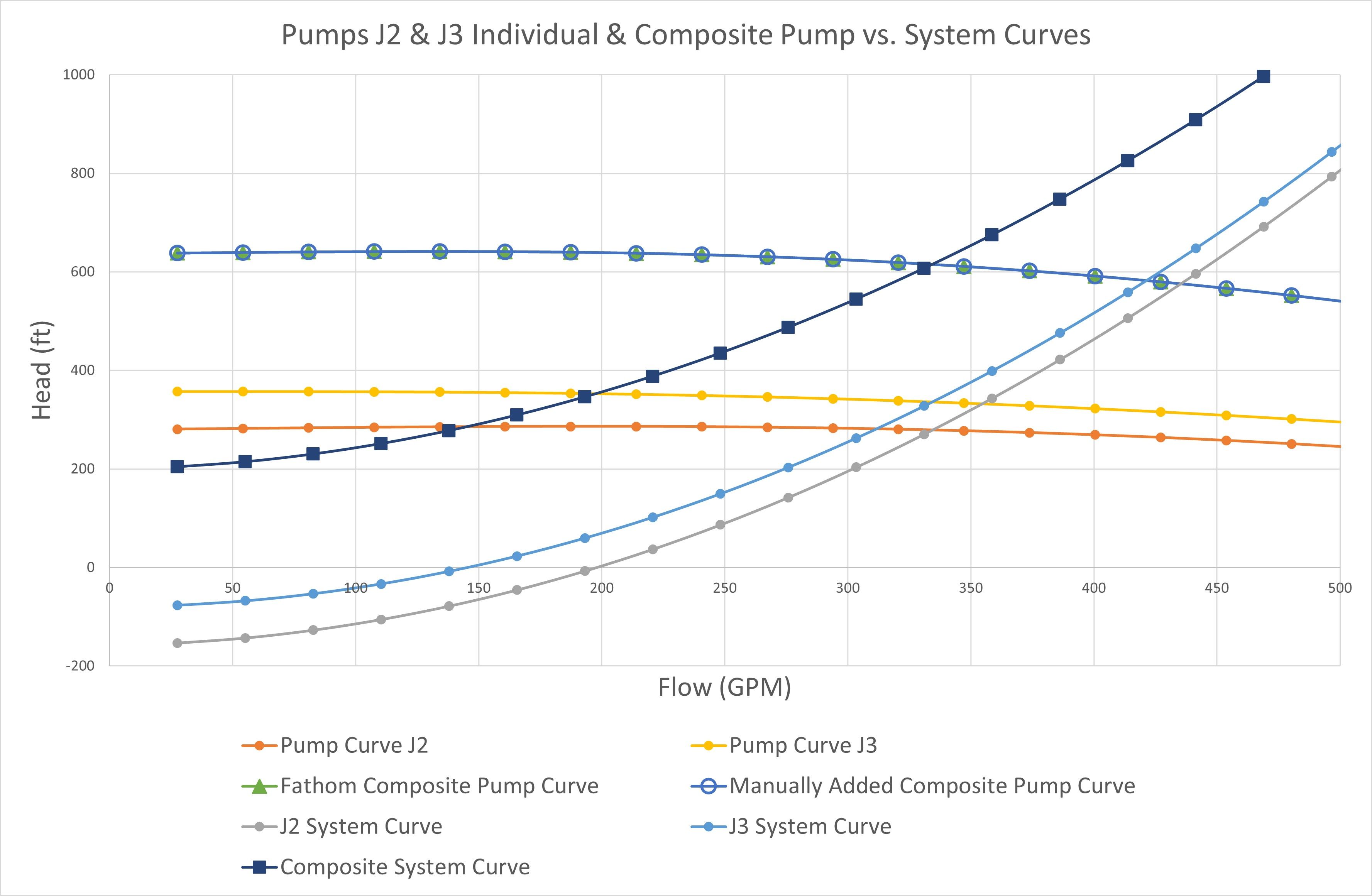 At a given flow rate, the head rise from each pump's individual curve is added together to obtain the composite pump curve for pumps in series. Figure 2 plots many pump and system curves together. First, concentrate on the different individual pump curves for J2 and J3. Datacor Fathom (formerly AFT Fathom) easily creates the composite pump curve with the click of a button. To verify the composite curve, I used the Datacor Fathom extended Time Simulation (XTS) module similarly to the previous blogs to determine a common flow rate through each pump at a given time step to easily calculate the pump head added across each pump. Then I manually added the total head for pumps J2 and J3 at a given flow to obtain a manual composite pump head. As you can see, the manual composite curve I calculated by adding the pump heads at each flow matches exactly the composite curve calculated by Datacor Fathom.