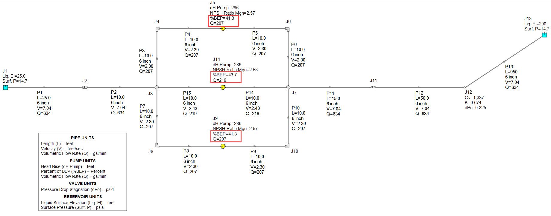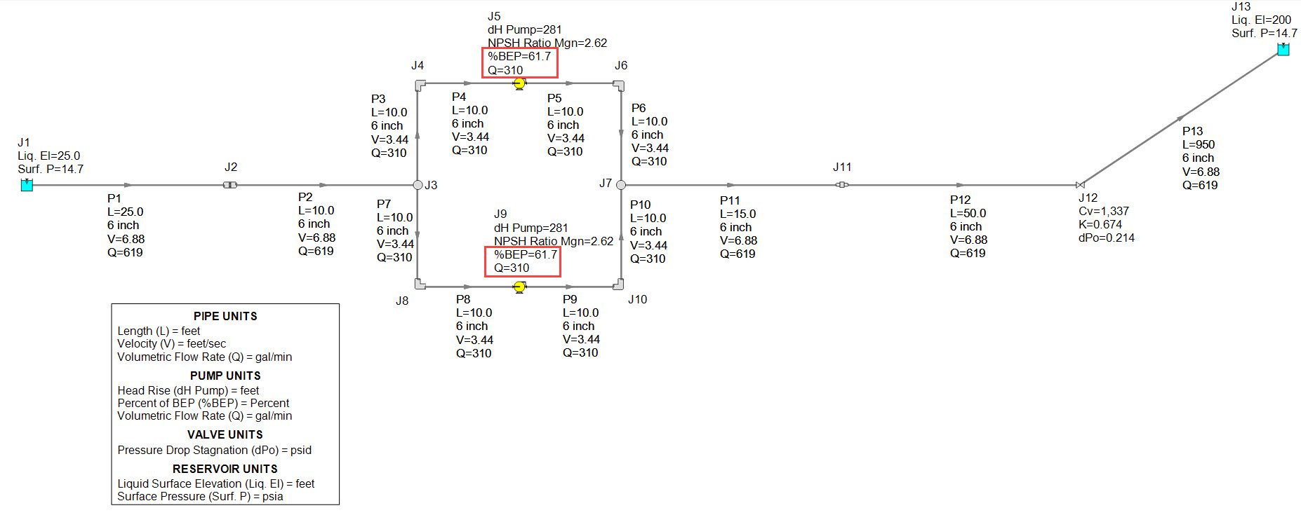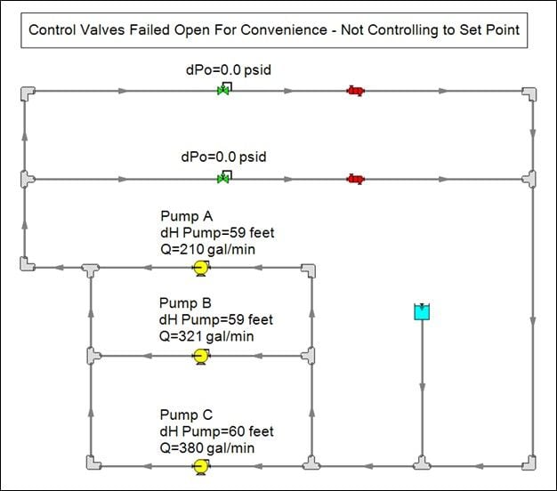 As you can see, the increase in flow through the pipeline is far less than what we were hoping for. We only got about 24% more flow with a second pump in parallel as in Figure 5 A and we were hoping for 50% more flow. Clearly, the flow did not double, which is sometimes expected. Also, be sure to notice that the pumps are now operating much further away from their BEP. Figure 5 B models three identical pumps in parallel with non-symmetrical piping which only generates 3% more flow, increasing from 619 GPM with two parallel pumps to 634 GPM with three parallel pumps! Very quickly we approach a point of diminishing return where adding more pumps does not generate that much more flow.