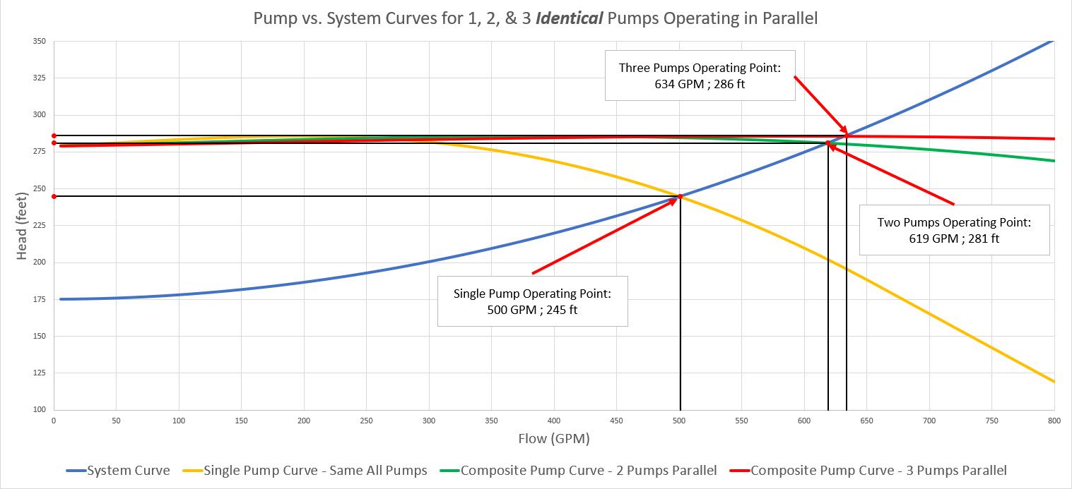 Consider the operating points from Table 1 for two or three pumps in parallel. It is apparent that the composite operating point where the composite pump and system curves intersect is the total flow through each pump added together while the pump head is the average of each of the individual pumps. However, this is NOT by design and the composite operating point only happens to be the case because the pumps and their curves are identical, and that this system is very symmetrical.