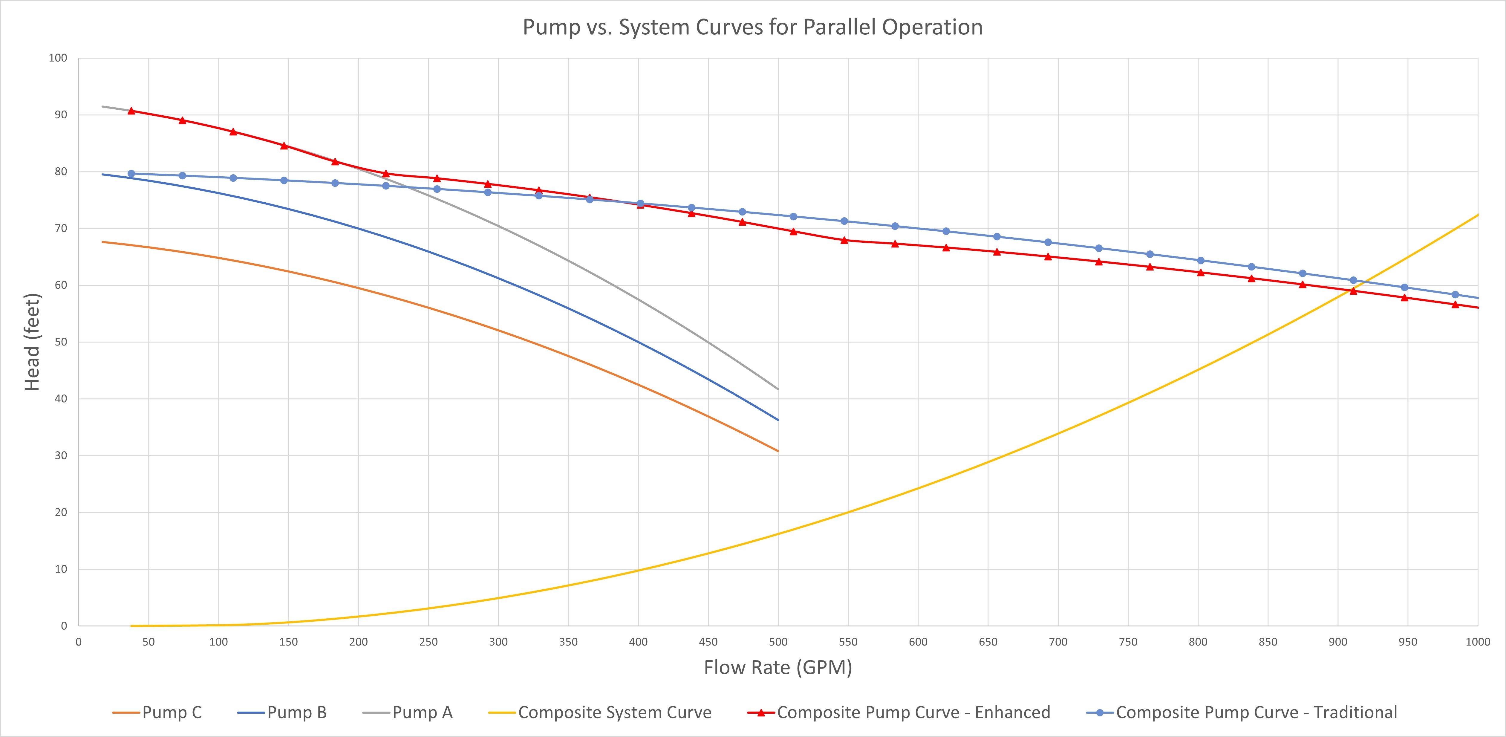 The Composite Pump Curve with the Traditional Method does NOT cross the Composite System curve at the total flow rate for each pump. This is where some ambiguity lies regarding generating composite pump and system curves for operating dissimilar pumps in parallel.